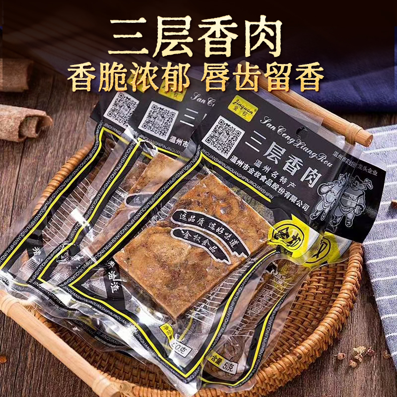 州市金权食品股份有限公司成立于2003年,坐落于风景秀丽的飞云江畔,飞云“双子桥”南端的104国道旁,毗邻甬台温高速。公司以诚信经营为基石,多次荣获食品安全信用体系建设达标单位、先进单位等荣誉;2009年,更是被确定为瑞安市农业产业化经营重点龙头企业单位。 经过近二十年的砥砺前行,金权食品现已发展成为一家规模化、多元化的食品企业。公司主要生产肉制品,包括三层香肉、猪肉条、猪油渣、猪油等系列产品,并正在开发瑞安特色肉制品进入全国市场。